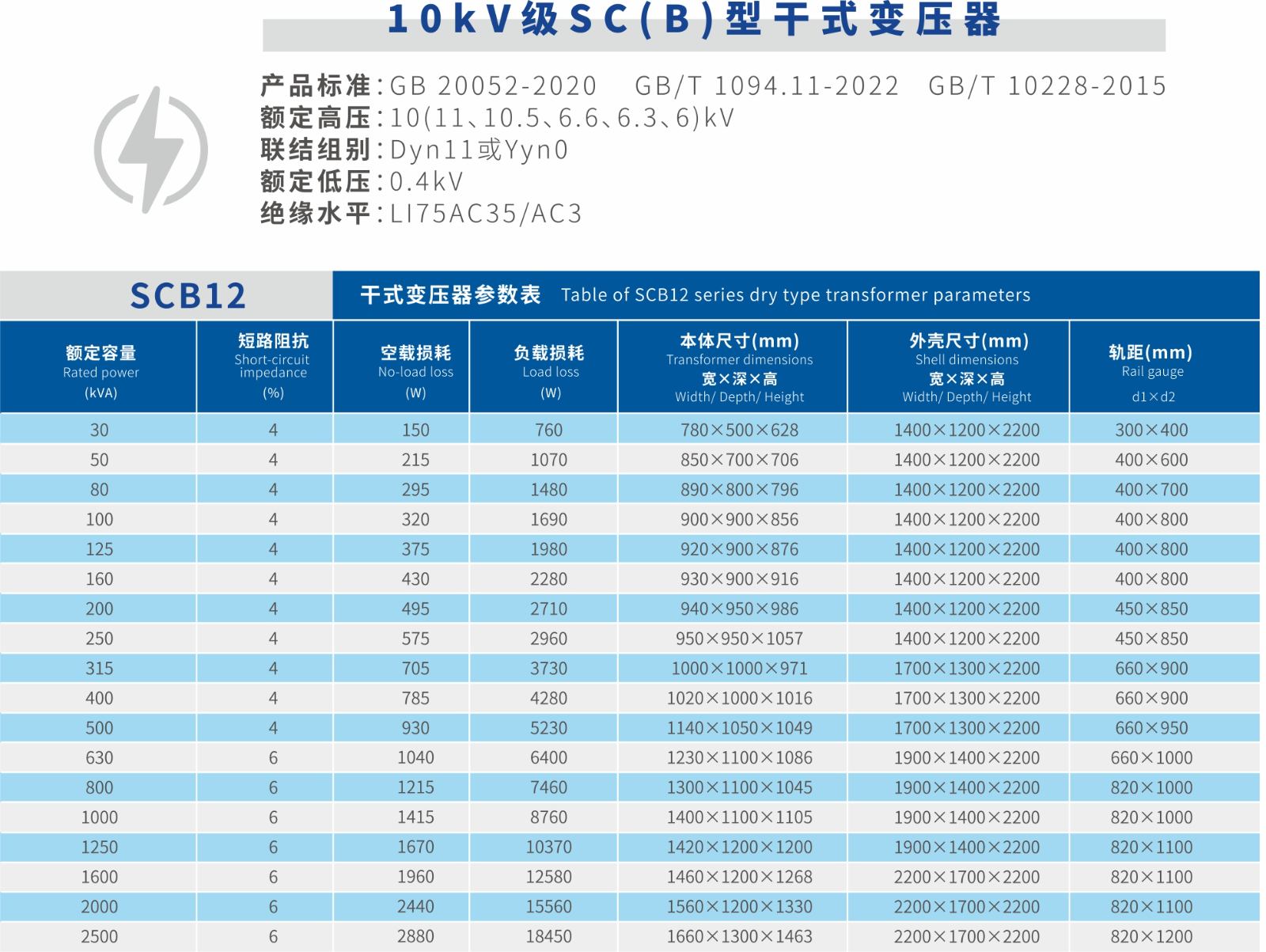 SCB系列環(huán)氧樹脂澆注干式電力變壓器,適用于三相、50Hz、配電電網系統(tǒng)。用于電網一次側的輸入、二次側的輸出,實現一二次側電壓的轉換。本系列的變壓器符合 IEC60076、GB/T10228、GB1094、GB20052-2020等國際/國家標準。通過溫度綜合控制器適時監(jiān)測變壓器的溫度狀態(tài),并控制超溫報警及超溫跳閘輸出,以保證變壓器運行在安全狀態(tài),從而延長變壓器的工作壽命。